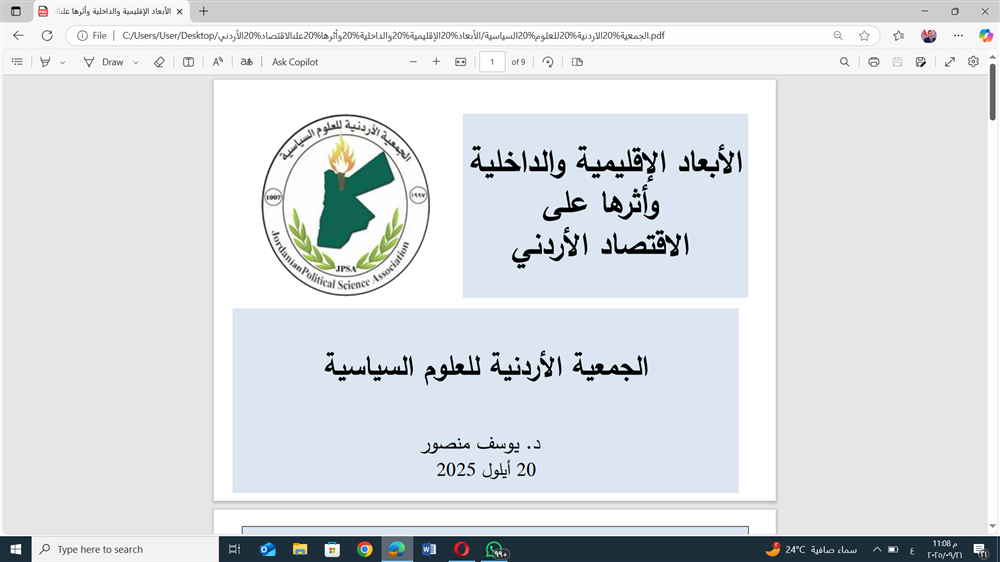 يسرنا ارفاق نص محاضرة الابعاد الاقليمية والدولية واثرها على الاقتصاد الاردني وتقرير حولها ، والتي القاها معالي الدكتور يوسف منصور وزير الدولة للشؤون الاقتصادية الاسبق، ونظمتها الجمعية الاردنية للعلوم السياسية، وذلك يوم السبت الماضي، والواقع بتاريخ 20/9/2025 في مقر الجمعية الاردنية للعلوم السياسية .